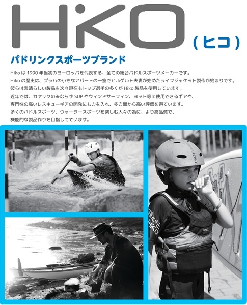 Hikoは1990年創業のヨーロッパを代表する、チェコの総合パドルスポーツメーカーです。Hikoの歴史は、プラハの小さなアパートの一室でヒルゲルト夫妻が始めたライフジャケット製作が始まりです。彼らは素晴らしい製品を次々に世に送り出し、多くのトップ選手が彼らをサポートしました。現在もトップ選手の多くがHiko品を使用しています。近年では、カヤックのみならずSUPやウィンドサーフィン、ヨット等に使用できるギアや、専門性の高いレスキューギアの開発にも力を入れ、多方面から高い評価を得ています。多くのパドルスポーツ、ウォータースポーツを楽しむ人々の為に、より高品質で、機能的な製品作りを目指しています。